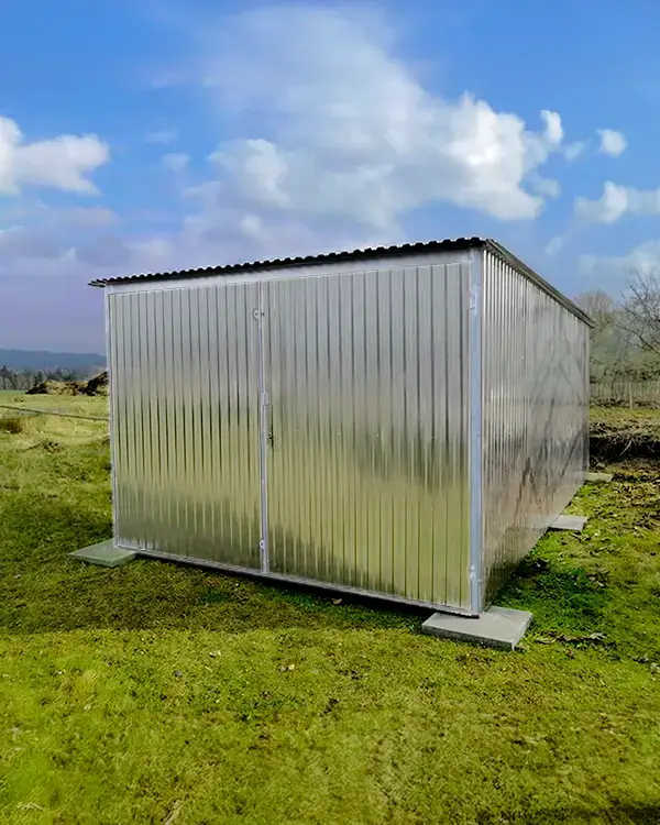 Oblíbená plechová garáž 3×5 m z pozinkovaného plechu se zadním spádem přímo od výrobce Stalconcept – doprava a montáž je v ceně.